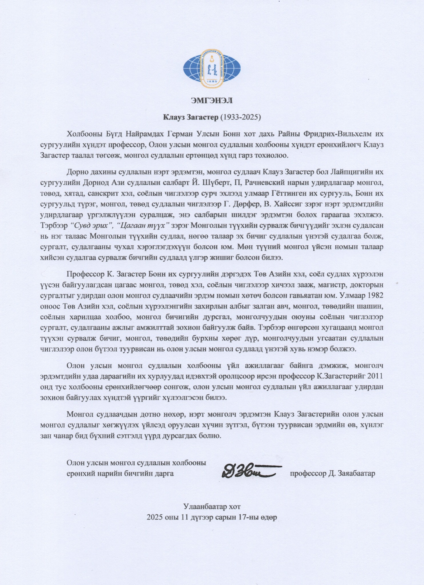 国際モンゴル学会事務総長Dalai Zayabaatar氏が寄せられた追悼文(モンゴル語原文 日本語訳)です。